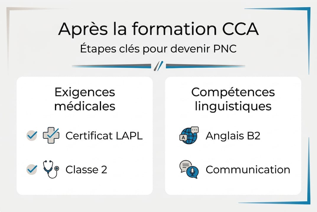 L'obtention du CCA ne suffit pas pour exercer comme personnel navigant commercial. Vous devez remplir des conditions médicales et linguistiques spécifiques pour être opérationnel sur les vols commerciaux. Ces exigences garantissent votre aptitude à assurer la sécurité des passagers dans toutes les situations.