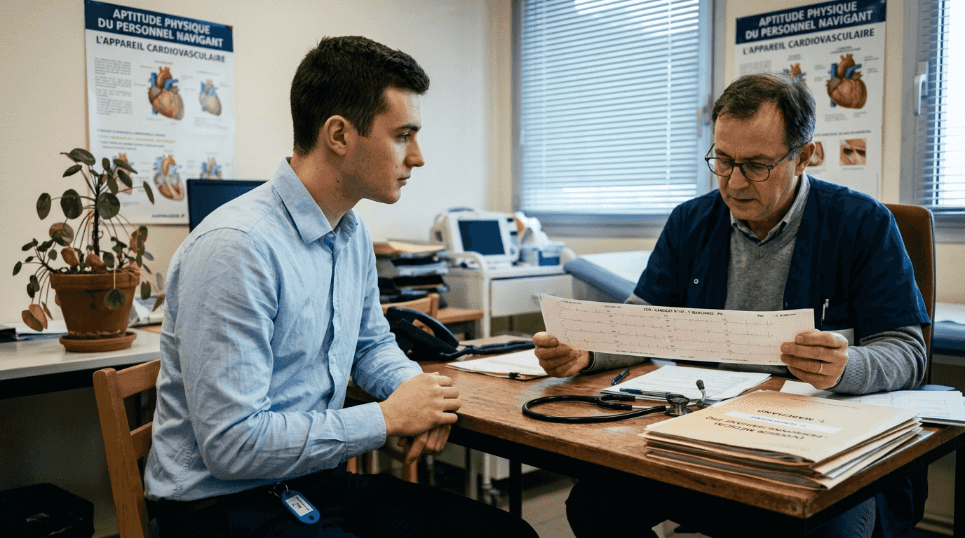 Le médecin évalue votre condition cardiovasculaire via un électrocardiogramme au repos, teste votre acuité visuelle avec et sans correction, et mesure votre capacité auditive. Des prises de sang vérifient l'absence de pathologies incompatibles avec le vol. L'entretien médical explore vos antécédents, vos traitements en cours et votre résistance au stress.