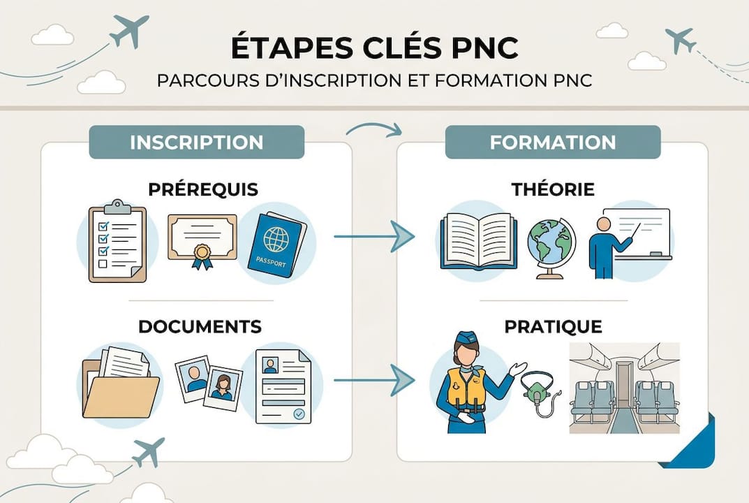 Conseil de pro : Avant de vous inscrire, vérifiez que le centre que vous visez est bien agréé par la DGAC (Direction Générale de l'Aviation Civile) ou une autorité EASA équivalente. Consultez le guide inscription personnel navigant pour une liste détaillée des documents à préparer. Les conditions officielles PNC sont publiques et consultables en ligne.